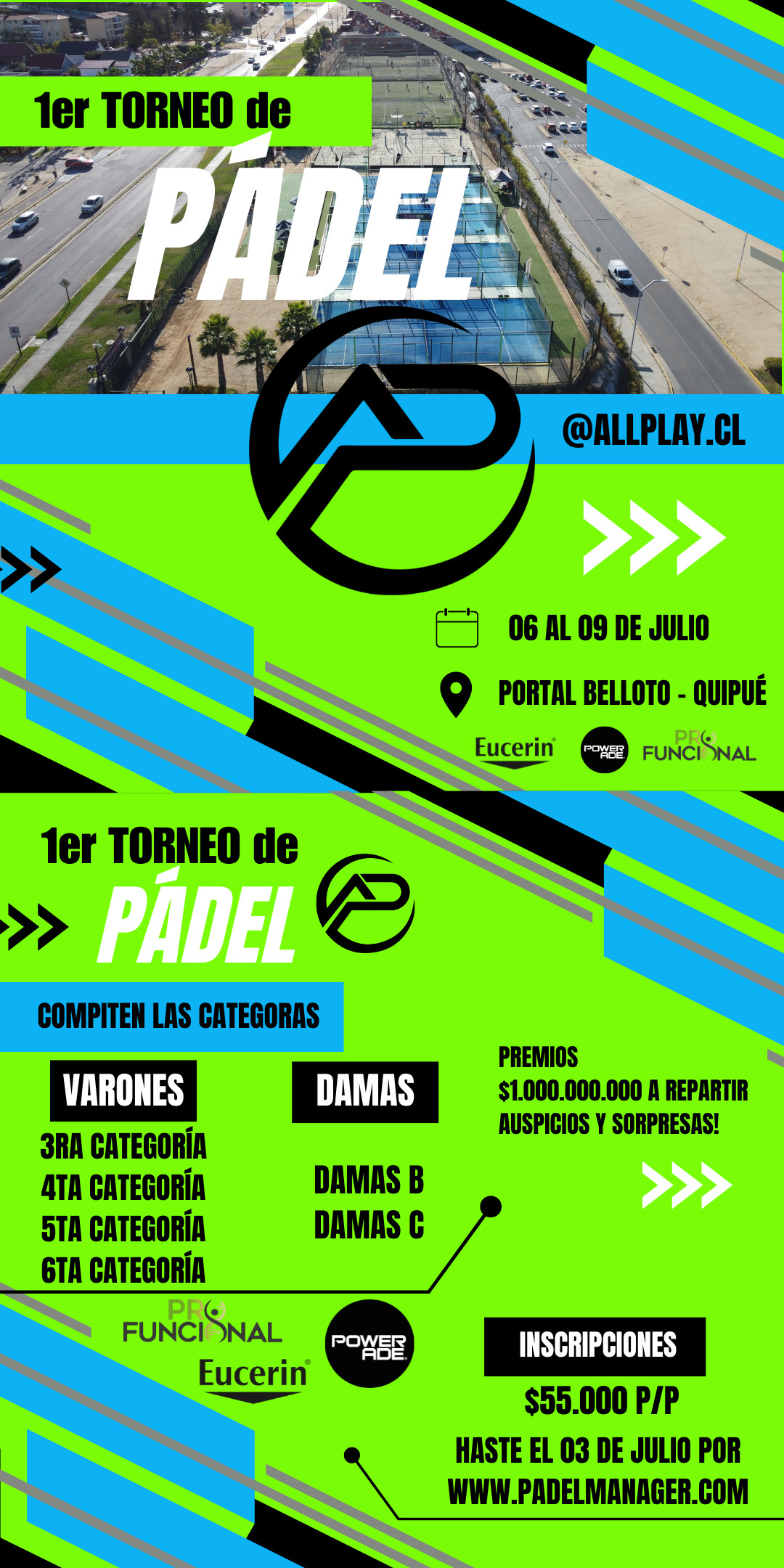 Centro deportivo de ultima generación, 4 pistas de pádel, 4 canchas de fútbol, 2 canchas de arena (voleibol, tenis playa y futvoley). Cafetería, estacionamiento, baños y camarines, todo en un solo lugar y vamos por mucho más! All play donde todos juegan y todos ganan.